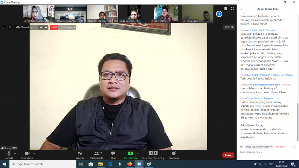 Bandung (18/5)-- Serial Diskusi Awasi Yuk! serial Jurnalis Bertanya Bawaslu Menjawab edisi pertama dengan tema Pencegahan dan Pengawasan di Masa Pandemi yang digelar secara daring pada Senin, 18 mei 2020 dengan peserta dari rekan-rekan media. Diskusi Awasi Yuk serial kali ini merupakan ... [selengkapnya]