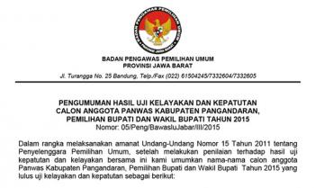 Dalam rangka melaksanakan amanat Undang-Undang Nomor 15 tahun tahun 2011 tentang penyelenggara Pemilihan Umum, setelah melakukan penilaian terhadap hasil uji kepatutan dan kelayakan bersama ini kami umumkan nama-nama calon anggota Panwas Kabupaten Pangandaran, Pemilihan Bupati dan Wakil Bupati ... [selengkapnya]