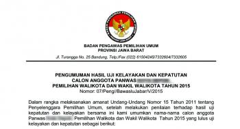 Dalam rangka melaksanakan amanat Undang-Undang Nomor 15 tahun tahun 2011 tentang penyelenggara Pemilihan Umum, setelah melakukan penilaian terhadap hasil uji kepatutan dan kelayakan bersama ini kami umumkan nama-nama calon anggota Panwas Kabupaten Cianjur dan Kota Depok, Pemilihan Bupati dan ... [selengkapnya]