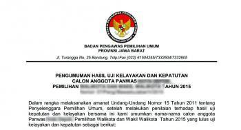 Dalam rangka melaksanakan amanat Undang-undang Nomor 15 Tahun 2011 Tentang Penyelenggara Pemilihan Umum, setelah melakukan penilaian atas hasil tes wawancara Calon Anggota Panwaslu Kab. Cianjur, Kab. Tasikmalaya dan Kota Depok , bersama ini kami umumkan nama-nama Calon Anggota Panwaslu yang ... [selengkapnya]